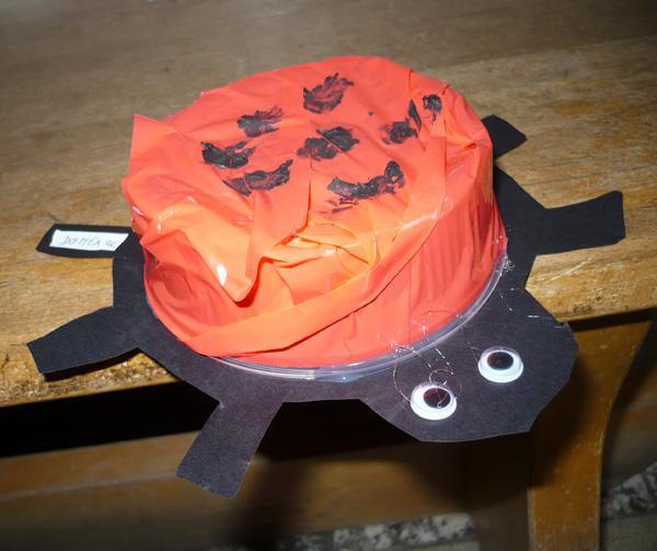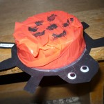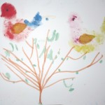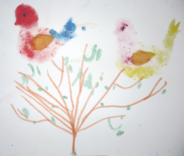 Postup: Celý baličák navlnkujeme válečkem se zelenou barvou. Po zaschnutí hnědou temperou nakreslíme větve každého keře. Zlatý déšť nakreslíme klasicky temperou – první uděláme listy, potom květy. Šeřík- první přes šablonu natupujeme listy. Houbičkou uděláme květy fialovou barvou.