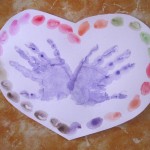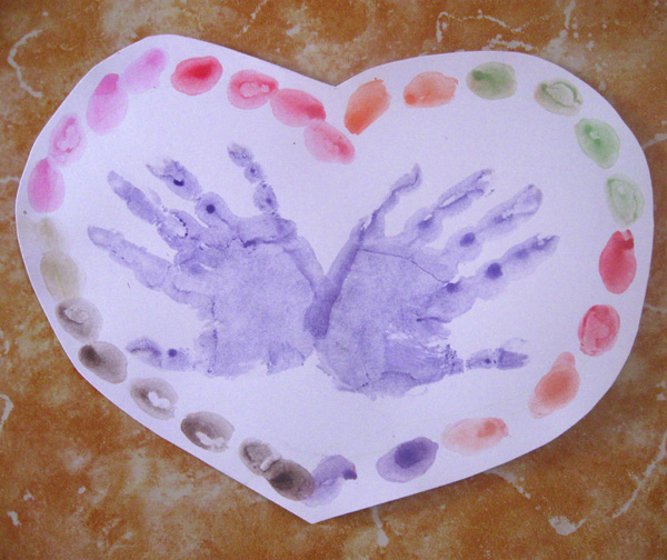 Postup: Na bílý papír si nakreslíme srdíčko tužkou. Po okrajích srdíčka obtiskujeme prsty – můžeme střídat barvy. Potom natřeme celé dlaně barvou a obtiskneme pravou dlaň na pravou půlku srdce a levou dlaň na levou půlku srdce. Srdíčko vystřihneme a máme hotovo.
