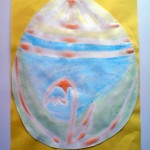 Velikonoční vajíčko, vyrobené klovatinovou technikou. Vajíčko vystřihneme, klovatinou namalujeme vzory, které budou poté bílé (v mém podání se to moc nepovedlo). Po zaschnutí klovatiny vybarvíme vajíčko barevnými křídami. Celý výrobek smyjeme vodou, měla by se smýt jen klovatina, křída má zůstat na svém místě. Děti tato technika moc bavila, byli na chvíli malí kouzelníci 🙂