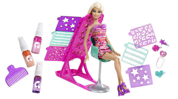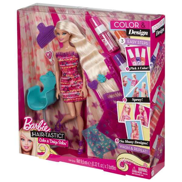 Barevné spreje mohou vytvořit působivý melír nebo vzory hvězdiček či proužku na pohádkově dlouhých vlasech. Změnit účes je tak snadné, stačí umýt vlasy v mycím koutku, osušit ručníkem a proměnit nový nápad v neuvěřitelně krásný účes. Barbie Vlasový design salon promění sny malé kadeřnice ve skutečnost.
