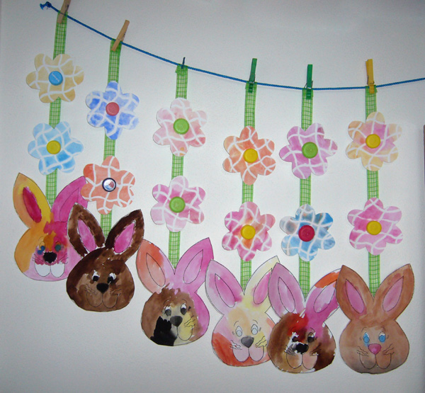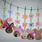 Dekoraci vyrobily děti z MŠ v Křižánkách – Velikonoční závěsná dekorace se zajíčkem Křištůfkem (Méďa Pusík – duben 2010). Kytičky nám rozkvetly díky kouzlu s kolavatinou a použili jsme vodové barvičky a vršky od PET lahví.