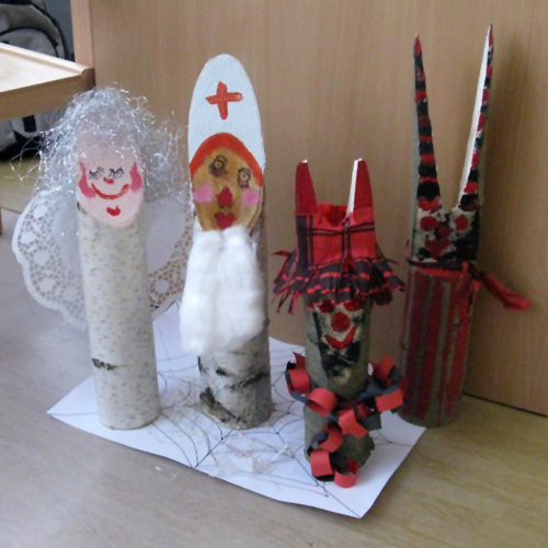 Postup: z tvrdého papíru vystřihneme půlkruh, který vymalujeme červenou temperovou barvou. Po zaschnutí spojíme půlkruh do kornoutku sešívačkou. Z barevných papírů vystřihneme obličej a čepici. Vše nalepíme na kornout, doplníme vousy z vaty. Detaily domalujeme černým fixem.