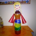 Budeme potřebovat: Prázdné PET lahve zelené barvy (MATTONI), nůžky, tavnou pistoli a lepidlo do ní, oboustrannou lepicí pásku, lepidlo HERKULES, prázdné obaly od léků (ACYLPIRIN) a celý pepř na oči, červený a žlutý barevný papír, malé plyšové kuličky na nos, zelený krepový papír na vlasy (zbytky), černý fix – popisovač na CD.