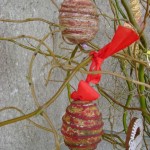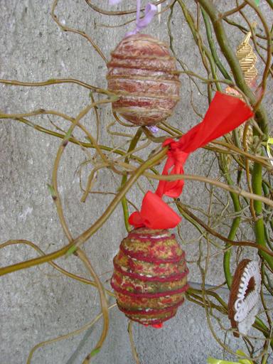 Vyrobil Honzík. Na vyfouknutá vajíčka nanesl pomocí houbičky temperové barvy. Po zaschnutí nalepil na vajíčka provázek, který ještě přebarvil. Blanka Lakomá