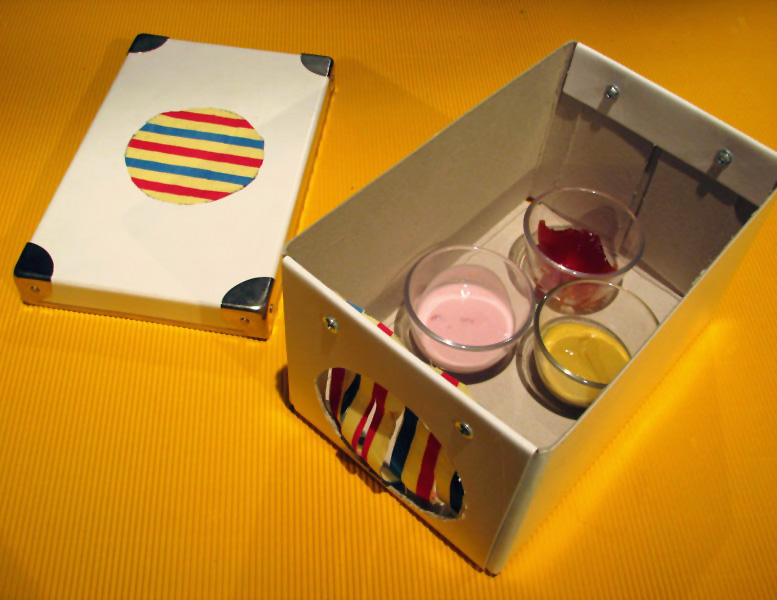 Postup: Na kratší straně krabice od bot si obkreslete kruh podle hrníčku. Otvor si nožíkem vyřízněte. Aby se do krabice nedalo zvenčí dívat, vystřihněte z látky malý obdélníček a nastříhejte ho zhruba do dvou třetin na tenké proužky. Ten pak vlepte pomocí lepicí pásky dovnitř do krabice nad kruhový otvor. Do krabice uložte několik předmětů, které se dají snadno hmatem rozpoznat, a vybídněte kamarády, aby prostrčili ruku otvorem a hádali, co to je. Do krabice můžete uložit taky misky s polotekutými potravinami (například: marmeláda, jogurt, hořčice, med, tvaroh).