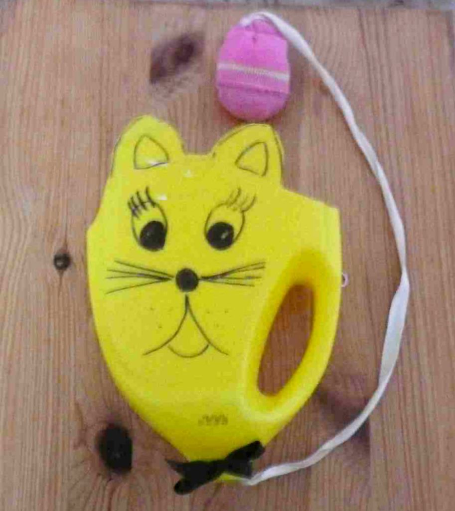 Na plastovou láhev nakreslete hlavu kočičky a vyřízněte. Dno nádoby musíte kompletně odřezat. Do dětské ponožky cca do poloviny nasypte krupky nebo rýži, čočku apod., zavažte nití, druhou polovinu ponožky přetáhněte ke špici a znovu zašijte. Vznikne míček v dvojitém ponožkovém obalu. Na míček přišijte provázek. Druhý konec provázku protáhněte dutým držadlem a zavažte. Chyťte láhev za držadlo a bez pomoci druhé ruky dostaňte míček do kočičky.