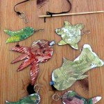 Pomůcky: slabší lepenka z vyhazovaných krabic, temperové nebo prstové barvy, drátek nebo háčky na záclony (ty na obrázku prodávají v Hornbachu), 2 tyčky, provázek.