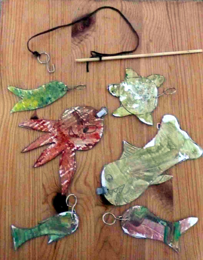 Vystříhejte z lepenky tvary ryb, chobotnice, želvy a jiných mořských živočichů. Nezapomeňte na strašlivého žraloka. Vyzvěte dítě, aby si rybičky vybarvilo. Starším dětem můžete pro inspiraci ukázat v knížce opravdové ryby nebo jim je najít na netu. Na okraj rybek udělejte dírku a provlečte očko od záclon nebo udělané z drátku. V nouzi jde očko udělat i z proužku papíru přilepeného izolepou, ale dlouho nevydrží. Na tyčku přivažte provázek a na jeho druhý konec háček. Rozházejte ryby kolem stolku nebo židle (= lodi) a uspořádejte velký výlov.