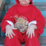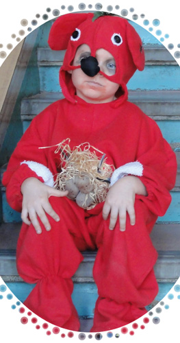 Maska přešitá z většího overálu, seno použito z aranžovací trávy z květinářství, kinder-vajíčka potažena rozstříhaným tričkem tělové barvy a ozdobené foukacími fixy. Na pacičkách našitá bílá jemně chlupatá látka, oči z knoflíků. (Darja K.)