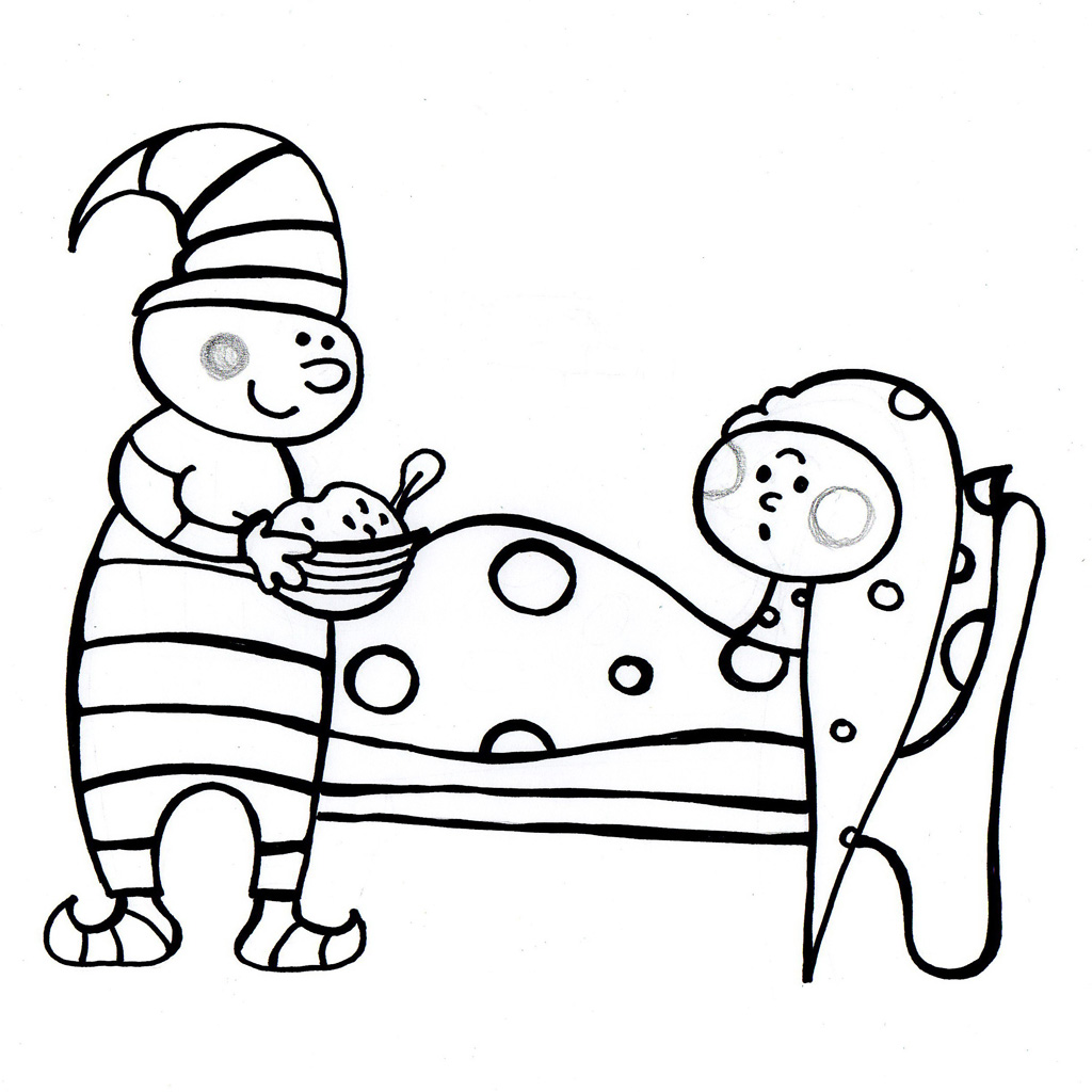 Proužek se rozhlédl. Kroužka nikde neviděl. Zaťukal na dveře chaloupky. Potom znovu, trochu silněji. A nakonec buch, buch, buch, zabouchal už docela silně. Pořád poslouchal, jestli neuslyší nějakou odpověď. Když zaklepal potřetí a nikdo se neozýval, chtěl odejít. Napadlo ho, že se asi Kroužek odstěhoval. Přece jen ale vzal za kliku. Bylo odemčeno. Vešel dovnitř. Hned viděl kolik uhodilo. Kroužek ležel v postýlce, byl celý hubený, puntíky na čepičce úplně vybledlé. Vypadalo to, že je s ním hodně zle.