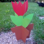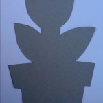 Z tvrdého papíru vystřihneme dvě stejné květiny. Ty pak buď namalujeme nebo oblepíme barevnými papíry. Já volila variantu s barevnými papíry, je to pracnější, každý díl (květina, květináč) se musí vystřihnout 4 krát a nalepit na tvrdý papír.
