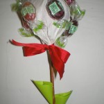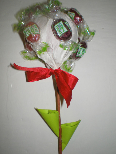 Potřebujeme polystyrenovou kouli, špejle, tavná pistole, bonbony, mašle. Špejli píchneme do koule a na kouli tavnou pistoli nalepíme bonbony, zavážeme mašlí a nalepíme listy. Kytku udělala s pomocí má 5-letá dcera Kačenka. (Marie B.)