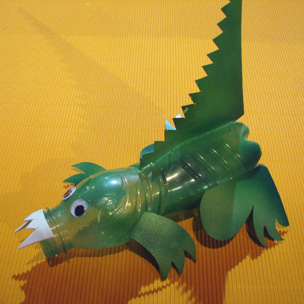 Materiál: menší plastová láhev, tvrdé barevné papíry, fixy, nůžky, lepicí páska, lepící pistole, pohyblivé oči.
