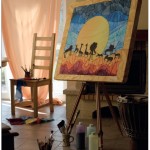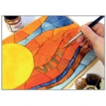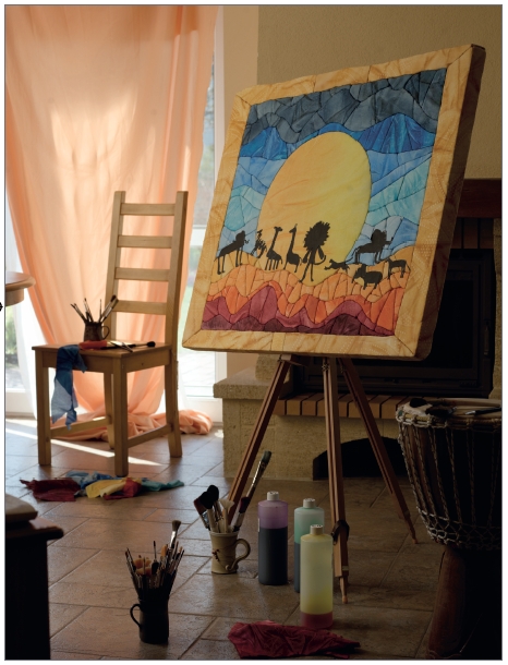 polystyrenovou desku o tloušťce nejméně 1 cm, rámeček, zbytky barevných látek nebo kousek světle látky k obarvení, řídké barvy na textil (vhodné jsou i barvy na hedvábí), skalpel a nůžky, špendlíky a tupý předmět na zapichování.