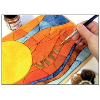 1. V případě, že použijeme zbytky barevných látek, přeskočíme krok 1–4. V opačném případě si rozložíme navlhčené kousky světlé přírodní látky například na sklo nebo igelit a plochým štětcem na ně naneseme barvu.