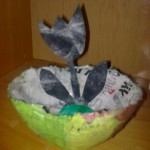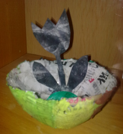 S Markem (necelé 4 roky) jsme vyráběli mističku s kytičkou. Mističku jsme vytvořili pomocí umělohmotné misky, kterou jsme pokládali proužky nastříhaného novinového papíru a potírali škrobem po zaschnutí jsme papírovou misku odloupli a pestře nabarvili. Dále do ní Mareček vložil kytičku, kterou jsem mu vystřihla a on ji dobarvil kouskem kuchyňské houbičky namočené ve vodovkách. (Pavla K.)