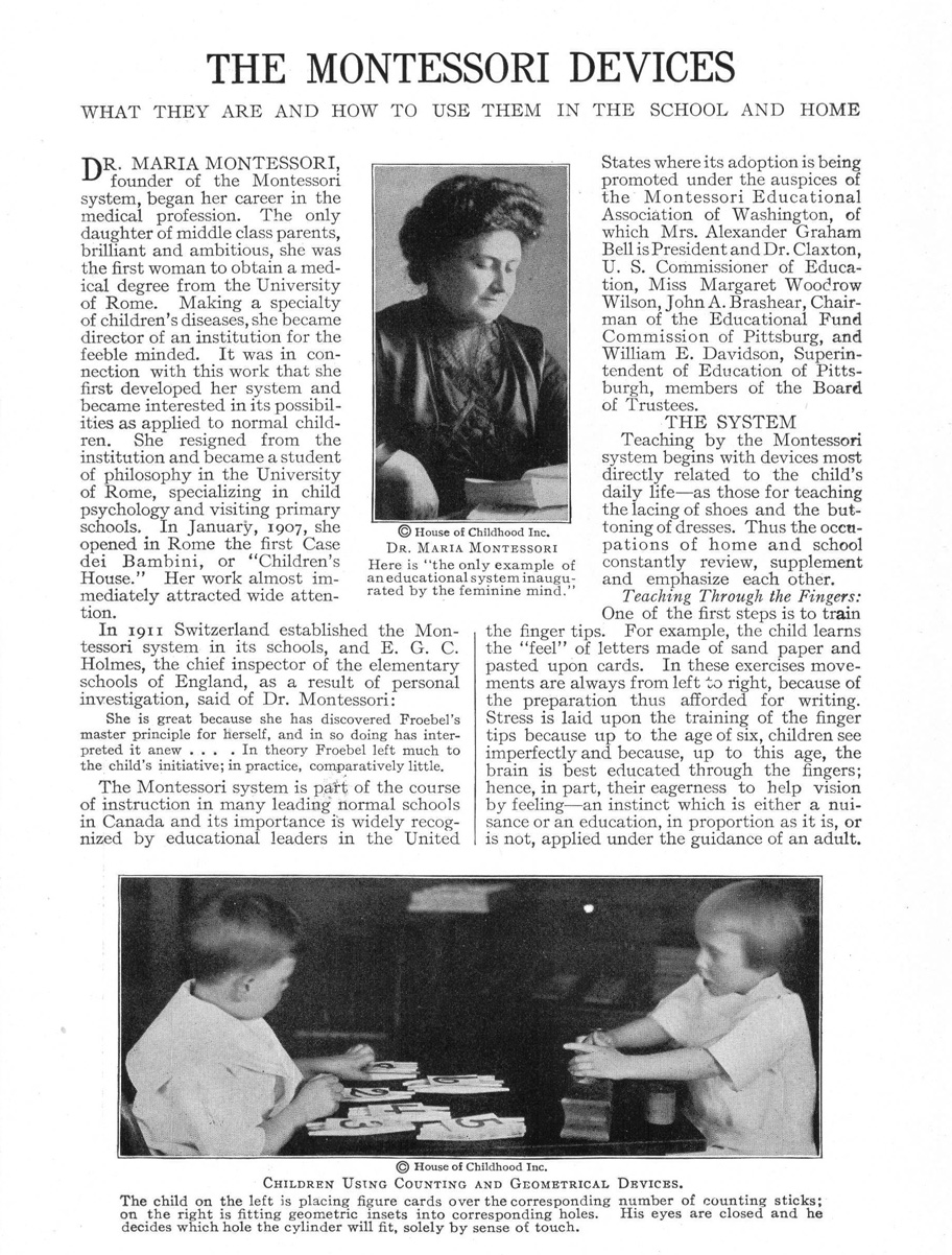Její metoda je založena na sebepoznávání, vychází z potřeb dítěte a učí ho rozvíjet jeho přirozené schopnosti a smyslové vnímání. Mezi základní principy patří tzv. senzitivní fáze. Dítě má ve vývojovém období přirozenou touhu po objevování a v každé této fázi se soustředí na jinou, pro něho v danou chvíli nejdůležitější činnost (smyslová, matematická, jazyková apod.). V tuto dobu je maximálně soustředěné na danou činnost. Pokud je dítě takto zaujato, nemá být vyrušováno a odváděno od práce a má mu být poskytnuto dostatek času na dokončení činnosti.