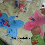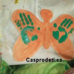 2. Obtisky prstů (viz růžový motýl) – technika pro hodně trpělivé děti. Barva se nanese na prst a prstem se dělají na motýla tečky a čárky.