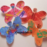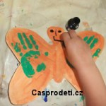 3. Obtisky celých dlaní (viz hnědý a oranžový motýl) – dlaně se jednoduše nabarví a obtisknou. Obtisky dlaní tvoří vzory na křídlech motýla.