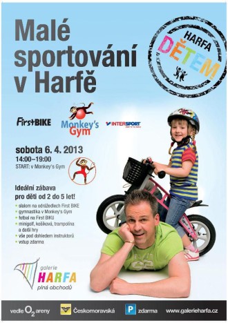 Probuďte vaše batole či předškoláka ze zimního spánku! Přijďte si s ním zacvičit a zajezdit na našich odrážedlech – nejenže se vaše dítko protáhne, ale také se naučí něco nového. Startujeme v krásném prostředí tělocvičny Monkey’s Gym, kde se dětem budou na jednotlivých nářadích věnovat zkušení instruktoři. Následuje jízda mezi kužely a fotbal na odrážedle First BIKE. Na dalších stanovištích se prckové projedou na plyšových ponících, zahrají si minigolf, okusí košíkovou a pořádně si zaskáčou na trampolíně. Po cestě budou sbírat razítka a na konci je čeká sladká odměna. Šikovná vizážistka mezitím maminkám poradí, jak na jarní líčení. Vstup zdarma. Sportu zdar a MALÉMU SPORTOVÁNÍ zvláště! Více na www.firstbike.cz, www.monkeysgym.cz a www.galerieharfa.cz