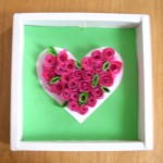 Předkreslíme si srdce na čtvrtku (podle velikosti krabičky), vystřihneme a nalepíme na podkladový barevný papír. Stočené proužky papíru lepíme na srdíčko – lepidlem nešetříme, aby dobře držely. Mezi růžové přidáme pár “zelených lístků”, které před nalepením trochu zmáčkneme mezi dvěma prsty – dostanou tak tvar.Na závěr barevnou čtvrku vlepíme do krabičky, můžeme na zadní stranu přilepit provázek k zavěšení. (Iveta L.)