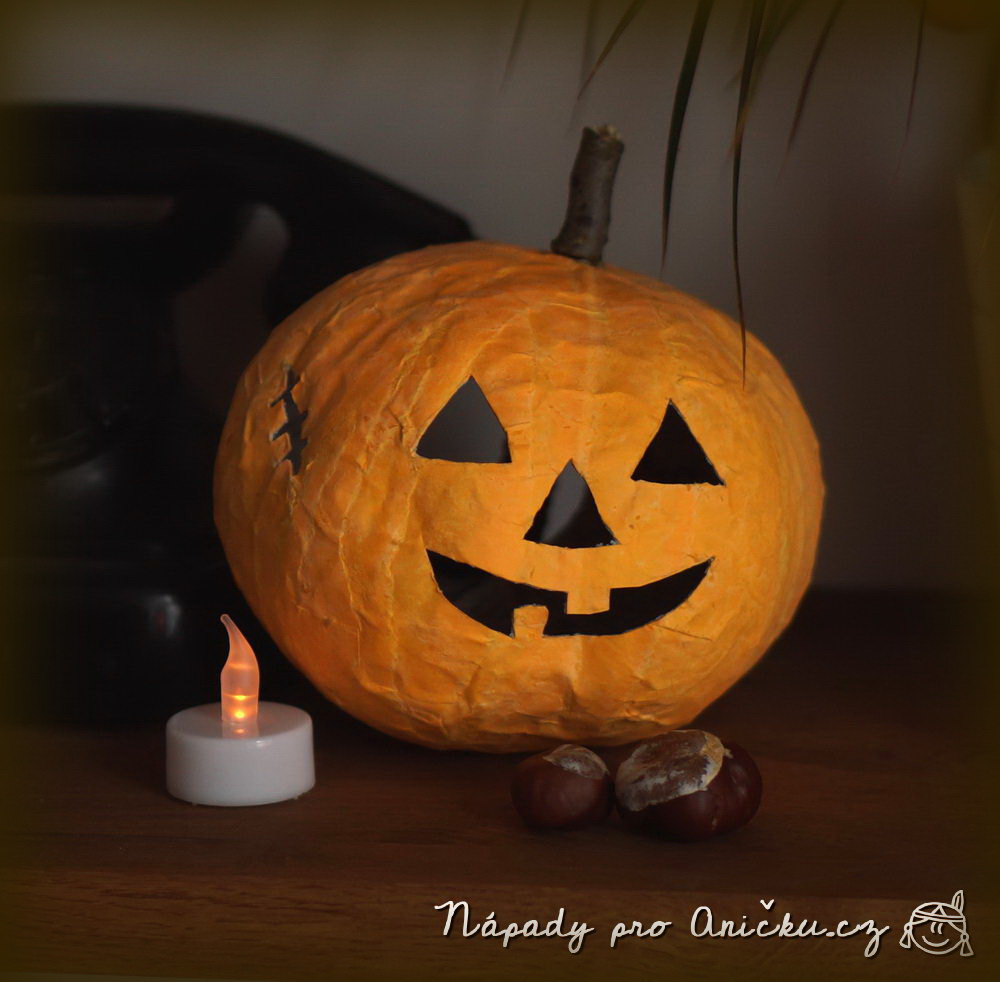Na kašírovanou halloweenskou dýni potřebujeme nafukovací balónek, provázek, hladkou mouku, vodu, noviny, barevný papír, misku a lámací nožík. Nafoukneme balónek a převážeme ho provázkem do tvaru dýně. V misce si připravíme směs, kterou budeme papír na balónek lepit – rozmícháme malou skleničku mouky (cca 1,5 dcl) s dvěma stejnými skleničkami vody. Do směsi ponoříme na proužky natrhané noviny. Namočené proužky lepíme postupně na balónek. Přilepíme dvě vrstvy novin a necháme do druhého dne usušit zavěšené. Druhý den opakujeme postup ale s oranžovým papírem, stačí přilepit jednu barevnou vrstvu. Zase necháme usušit. Na vršek dýně přilepíme kousek klacíku nebo korkový špunt tavnou pistolí. Nakonec do dýně vyřežeme lámacím nožíkem obličej a ze zadní strany otvor pro vložení svíčky. Používáme raději elektrické svíčky:). Hezký Halloween všem!