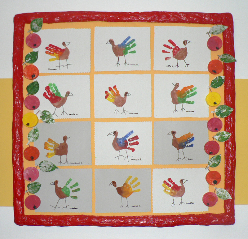 Dítěti natřeme ručku temperovými barvami – buď barevně, pestře, nebo černě-vrány, …, otiskneme na papír, důležité je postavení prstů, paleček co nejdál od prstů, prstíky příliš neroztahovat, zobáček, očko a nožky děti dokreslí černou fixou.
