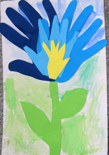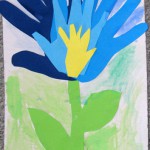 Vyráběli jsme rodinnou kytku. Každý ze členů rodiny si na barevný papír nakreslil svou ruku a vystřihl (za našeho mimíska to samozřejmě udělal starší brácha). Když byly ruce připravené, tak jsme je nalepili od největší po nejmenší na bílý papír. Starší syn dobarvil trávu a já jsem potom předkreslila na zelený papír stonek s listy, který vystřihl a dolepil.