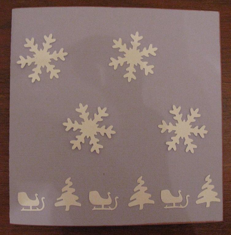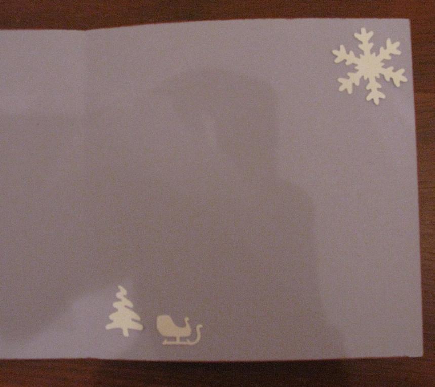 U tohoto blahopřáníčka je postup rovněž velice jednoduchý. Modrá čtvrtka se přepůlí a přeloží napůl, vznikne tak blahopřáníčko o velikosti 15x15cm. Vykrajovátky sněhová vločka, stromeček a saně si vysekáme z bílé čtvrtky zmíněné tvary. 5x sněhovou vločku, 4x stromeček a 4x saně. Nalepíme na přáníčko viz ukázka, vnitřní část rovněž dozdobíme.