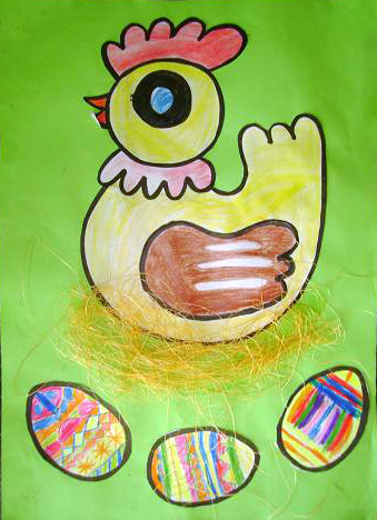 Vytvořil Honzík. Nakopírovanou šablonu vajíček a slepičky vybarvil a vystřihnul a nalepil na zelený podklad, který dozdobil kokosovým vláknem. Blanka Lakomá