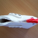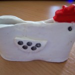 Slepička je vyrobená ze samotvrdnoucí hmoty (tato je z bílé, ale terrakota je také pěkná). Děti vyválely placku, ze které podle šablony vyřízly obdélník (záleží, jak chceme mít velkou slepičku – tato je vysoká 5cm).