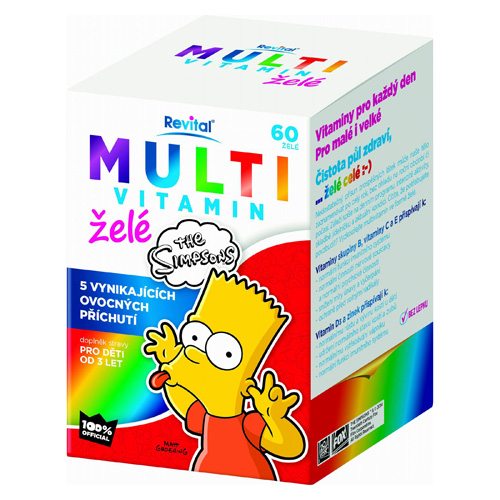 - The Simpsons Multivitamin želé 60 – The Simpsons je extra jemné želé, nabité nejen chutí, ale i vitamíny. Obsahuje vitamín C i jeho přírodní zdroj – extrakt z šípku. Kromě tohoto důležitého antioxidantu, kterým céčko bezesporu je, dodá tělu i komplex vitamínů B, taky D3 a navíc jod i zinek. Jde o zdravý koktejl, který se stará ocelkovou pohodu organismu – normální činnost imunitního systému, nervové soustavy a vývoj i stav kostí a zubů.