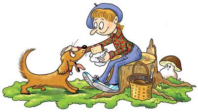 na tomto obrázku je pan malíř a jeho pejsek Mates. Za pařízkem vykukuje jedna houba, kterou můžeme sbírat. Je moc dobrá do polévky, do smaženice i naložená v octě.