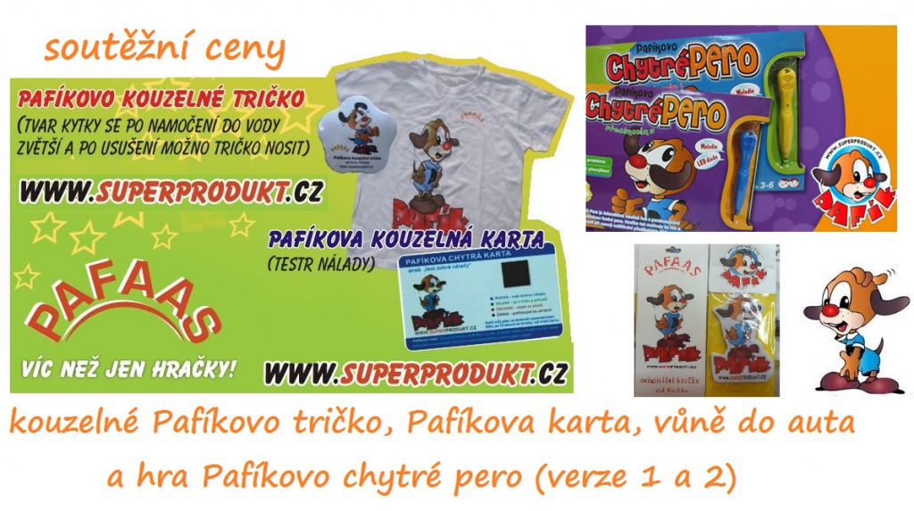 Můžeš namalovat pejska Pafíka podle své fantazie, nebo složit básničku o Pafíkovi a poslat na e-mailovou adresu: akce@superprodukt.cz nebo poštovní adresu: Pafaas – Pafík, Hlavice 3, 46348 pošta Všelibice. Ze všech obrázků a básniček vybereme dva vítěze a autor (básničky i obrázku) obdrží tuto cenu – balíček dárků:
