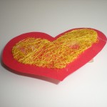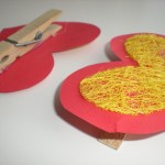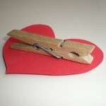 Popis: Nakreslíme si na červený papír srdce a vystřihneme jej. Menší srdíčko vystřihneme ze sisalu, které přilepíme k papírovému srdíčku. Tavnou pistolí připevníme kolík na prádlo, abychom srdíčko mohli připevnit na viditelné místo. Takto ozdobeným kolíčkem můžeme připnout vlastnoručně nakreslené přáníčko.