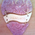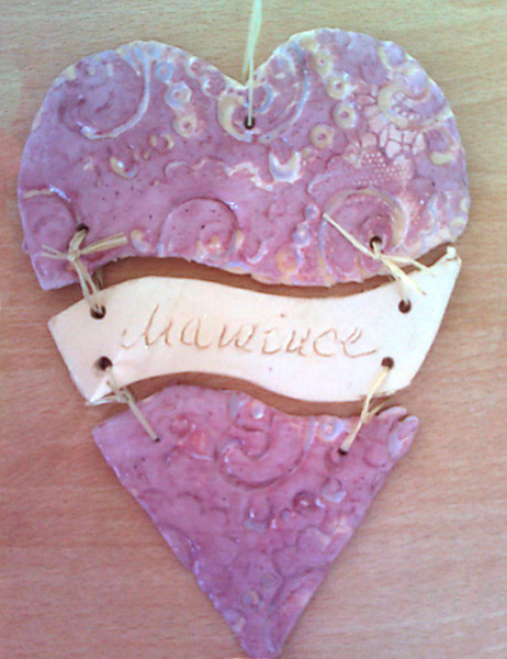 Srdíčko vyrobené z keramické hlíny, podle šablony, 3 díly, vyryté párátkem, válečkem převáleno přes krajku, do prostředního dílu vepsáno p.učitelkou “mamince”, spodní a vrchní díl nabarven růžovou barvou, po vypálení naglazován a přepálen. Díly jsou spojeny lýkem. Natálka 5 let. (Denisa K.)