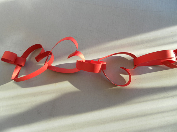 Tvrdý červený papír,stříhaný na různě dlouhé pásky, které jsou v polovině přeloženy a koníkem zcvaknutý do tvaru srdíčka,další díl je provlečen již vytvořeným srdcem a zcvaknut, je velmi hezké, pokud se velikosti srdíček mění. (Denisa K.)