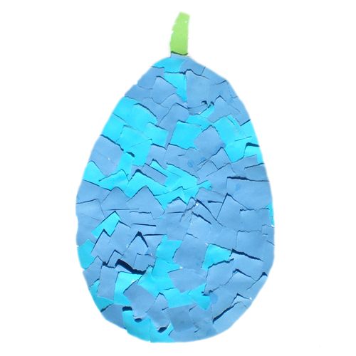 Na fotce je švestka. Natrhané kousky barevného papíru, nalepované na bílou čtvrtku. Tadeáš (3 roky).