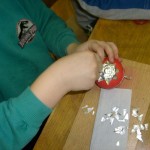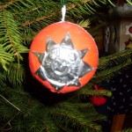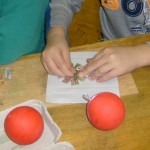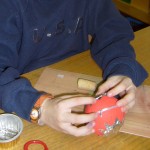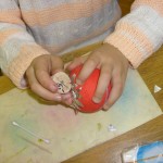 Popis činnosti: na polystyrenovou kouli jsme nejptve nalepili stužku s očkem na zavěšení. Pak jsme si připravili dvě hliníková sluníčka, která jsme pomocí špendlíků s kovovou hlavičkou připevnili na kouli z obou stran. Výroba sluníček: Kalíšek od čajové svíčky nastřihneme na osmi místech – orientujeme se podle vylisovaného vzoru ve dně. “Paprsky roztáhneme, zastřihneme do špičky a na měkké podložce vyryjeme špičatým nástrojem (propiska, párátko…) obličej sluníčka.