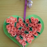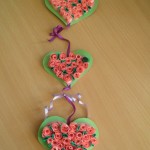 Srdíčka vyráběly předškolní děti naší MŠ. Nejdříve si děti nachystají dostatečnou zásobu růžových namotaných ruliček. (proužky papíru namotávají na špejli a konec zalepí). Vystřihnou větší srdíčko zelené barvy, menší růžové barvy. Na růžové lepí ruličky z růžového papíru, až ho celé polepí. Mohou vložit zelené ruličky trošku zmáčknuté jako lístečky. Mezi zelené a růžové srdíčko vlepíme stužku, pro zavěšení.