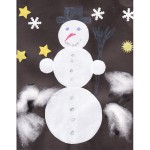 Popis: Na bílý papír uděláme kružítkem tři kruhy (každý má jinou velikost od největšího po nejmenší), vystřihneme je a nalepíme na černý papír.Dále vystřihneme malé kruhy jako ruce sněhuláčka, které také nalepíme. Pastelkami namalujeme …