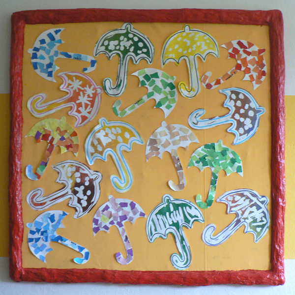 - Mráčky děti malovaly tak, že otiskovaly houbu, trávu namalovaly otiskováním dlaní a prstů.