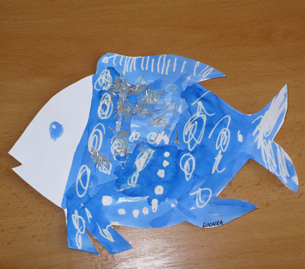 Podle šablony obkreslíme tvar kapra na karton a vystřihneme jej. Tužkou si naznačíme uspořádání šupin, tvar pusy, ploutví a oka. Lepidlem si vytvoříme linie za pomocí štětce a na ty posléze klademe kolínka ve tvaru šupin. Je nutno nešetřit lepidlem, aby těstoviny pevně držely. Oko vytvoříme opět těstovinami ve tvaru kolínek a ty klademe po obvodu. Dále …
