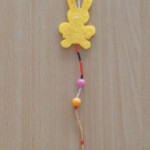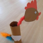Kohout – rulička od kuchyňských utěrek, obalená hnědým barev.papírek, z plyšového drátku vytvořen krk kohoutka, vlepen mezi dvojitou hlavu, očko z perleťového knoflíku, dolepena barvená peříčka.