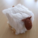 Ovečka – krychle z molitanu je olepena čtverečky z leskyma,nohy jsou nalepeny z korkových zátek nakrájených na kolečka, dolepena hlavička, očka z korálků.