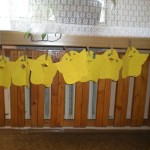- Prstovými barvami kuřátko vymalujeme, dokreslímě oči.