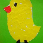 Vytvořil Mareček 3 roky. Na vystřiženou šablonku kuřátka lepil kousky vytrhaného barevného papíru. Blanka Lakomá