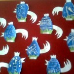 - Kohouti – z tvrdého papíru vystřižen tvar vejce, malování inkoustem a vyzdobeno inkoustem, dolepen bílý zobáček a ocas.