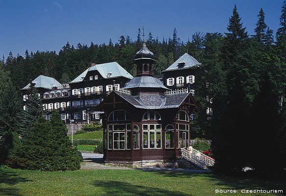 V hustých lesích, kde nyní lázeňské místo Karlsbrunn leží, před dávnými časy zbožný poustevník život svůj trávil v modlitbách, odloučen od ostatního světa hříšného. Pohříživ se jednou v tuhý spánek za noci letní, spatřil svatého Huberta. Svatý táže se, co by si poustevník přál. Poustevník přemýšlel a konečně odpověděl: „Chci nemocným prospívati.“ — Probudiv se ze sna, zbožný poustevník …