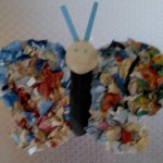 Na druhém je motýlek, syn vystřihl motýlka pak natrhal a zmačkal barevné papíry a nalepil na křidýlka, poté jsem dokreslila prostředek a nalepili jsme tykadýlka.